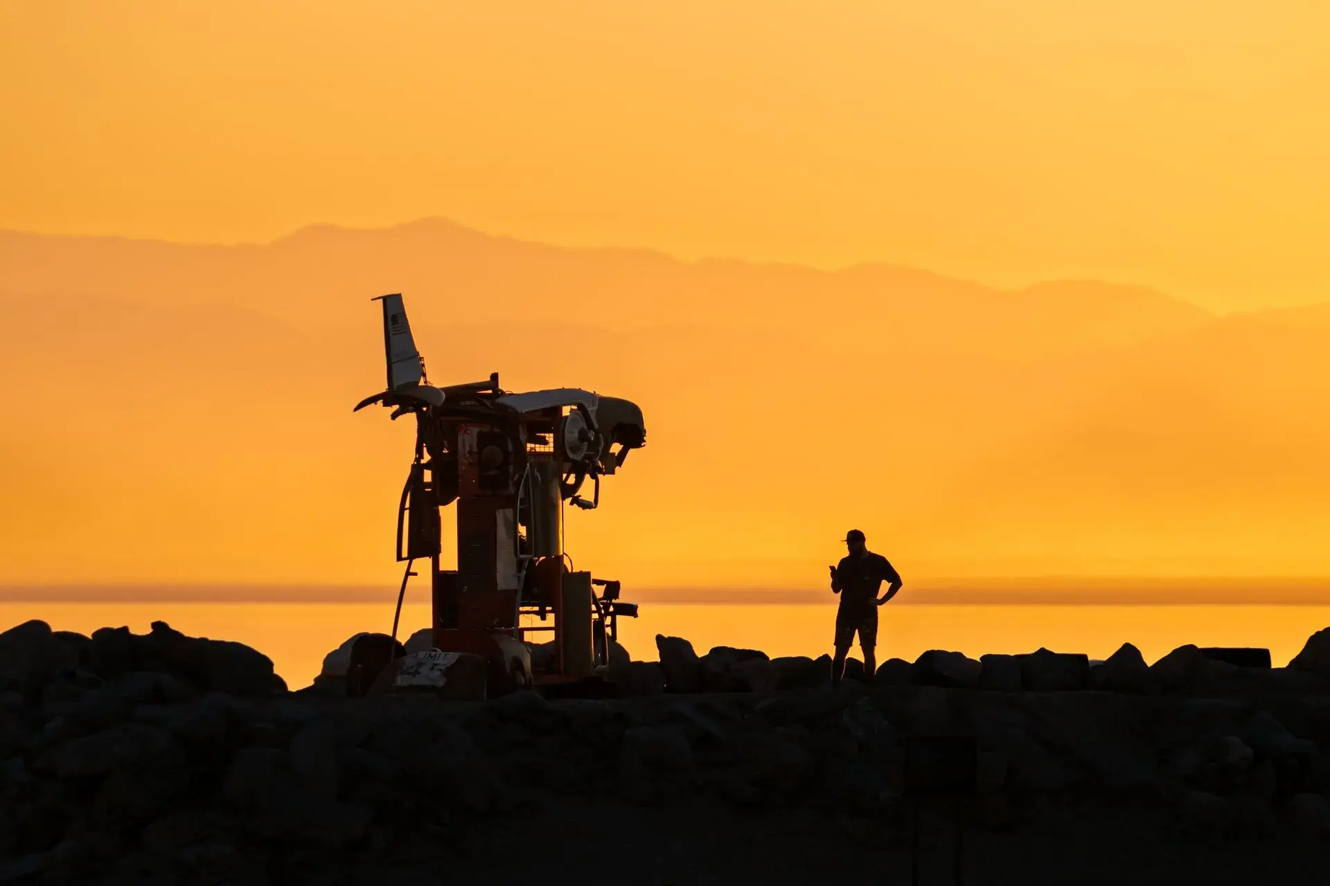 This surreal installation near Bombay Beach stood like a machine-age totem at the edge of the Salton Sea. The lone figure in frame wasn’t staged — he just wandered into the moment, perfectly timed against a sunset that painted the sky in molten gold.