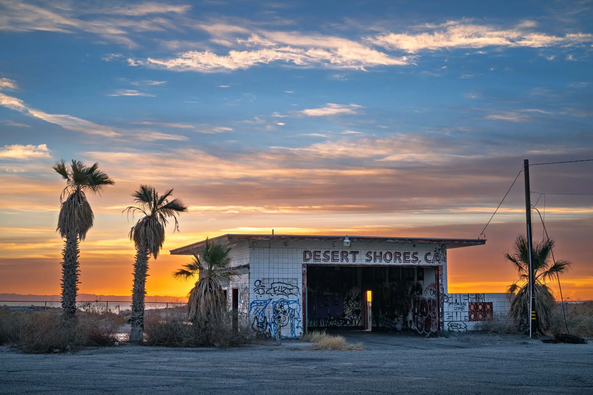 The old Desert Shores Fire Hall still stands at the edge of the Salton Sea—faded, graffitied, and hollow, yet somehow still clinging to presence. The colors of dawn don’t care about decay—they simply show up, lighting even the forgotten places.